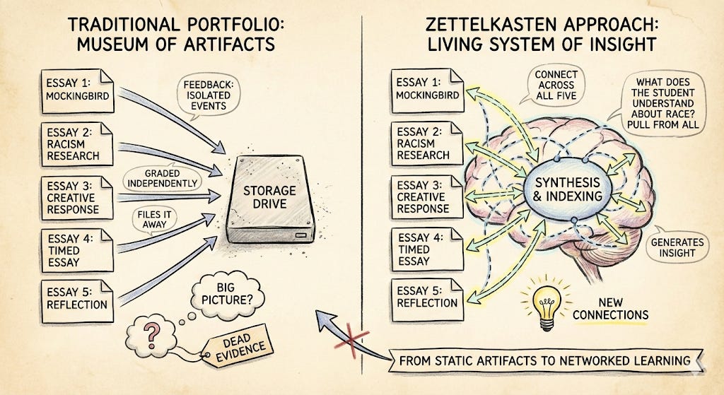 With a Zettelkasten approach, a portfolio works differently. All five essays upload into a system. Not just a ‘storage’ drive but they’re indexed. They connect. A teacher, or the student themselves, can ask: “What does this student actually understand about race? Pull from all five essays.” The system doesn’t just retrieve the one essay about racism. It synthesises across all five because they’re networked.