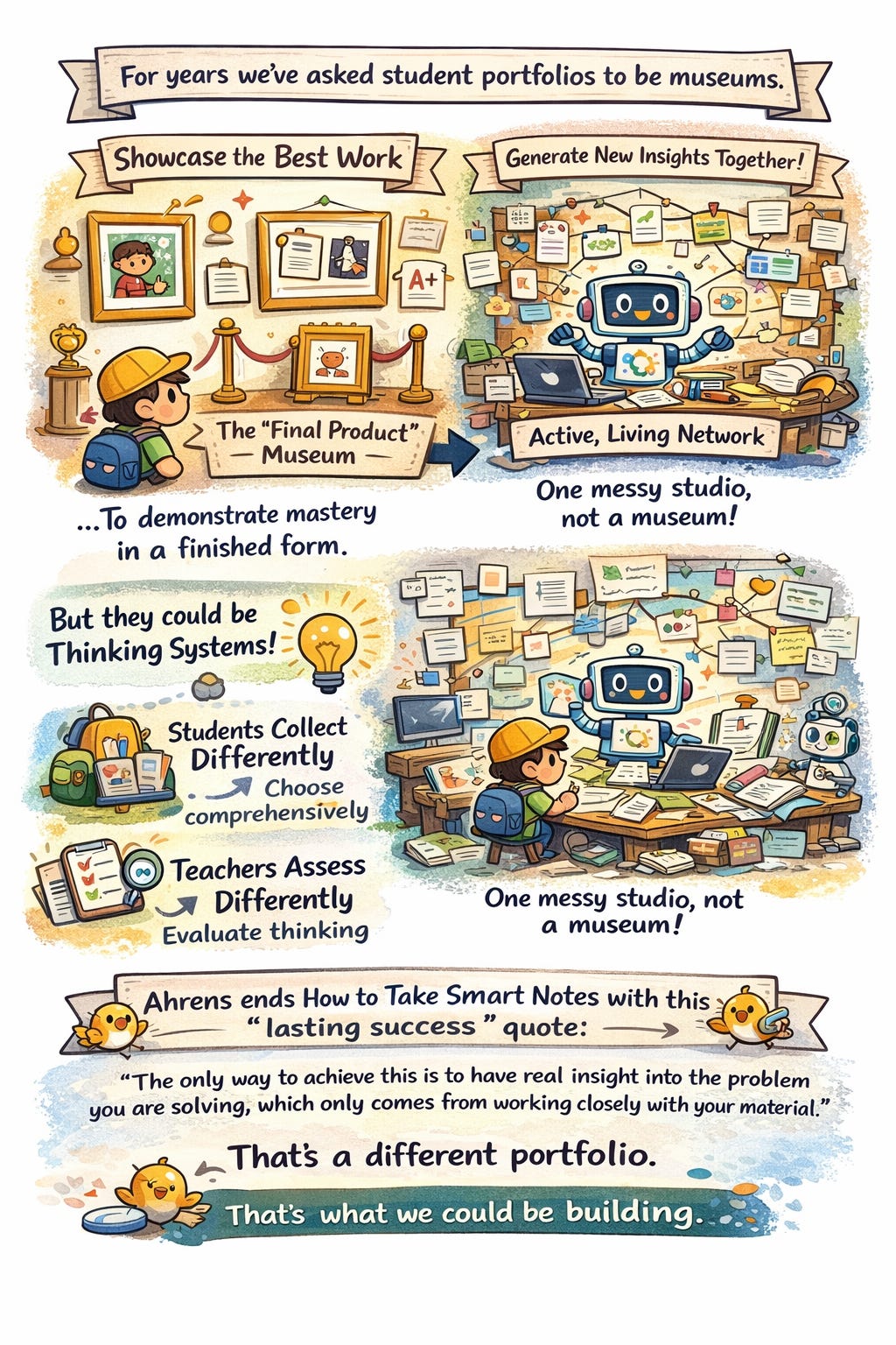 Ahrens talks about note-taking as building a “network of ideas.” A good portfolio becomes that network. Each artifact connects to others. New work can be generated from the connections.