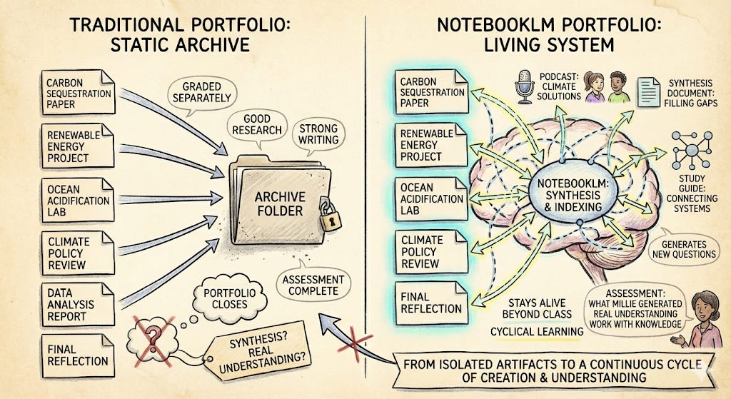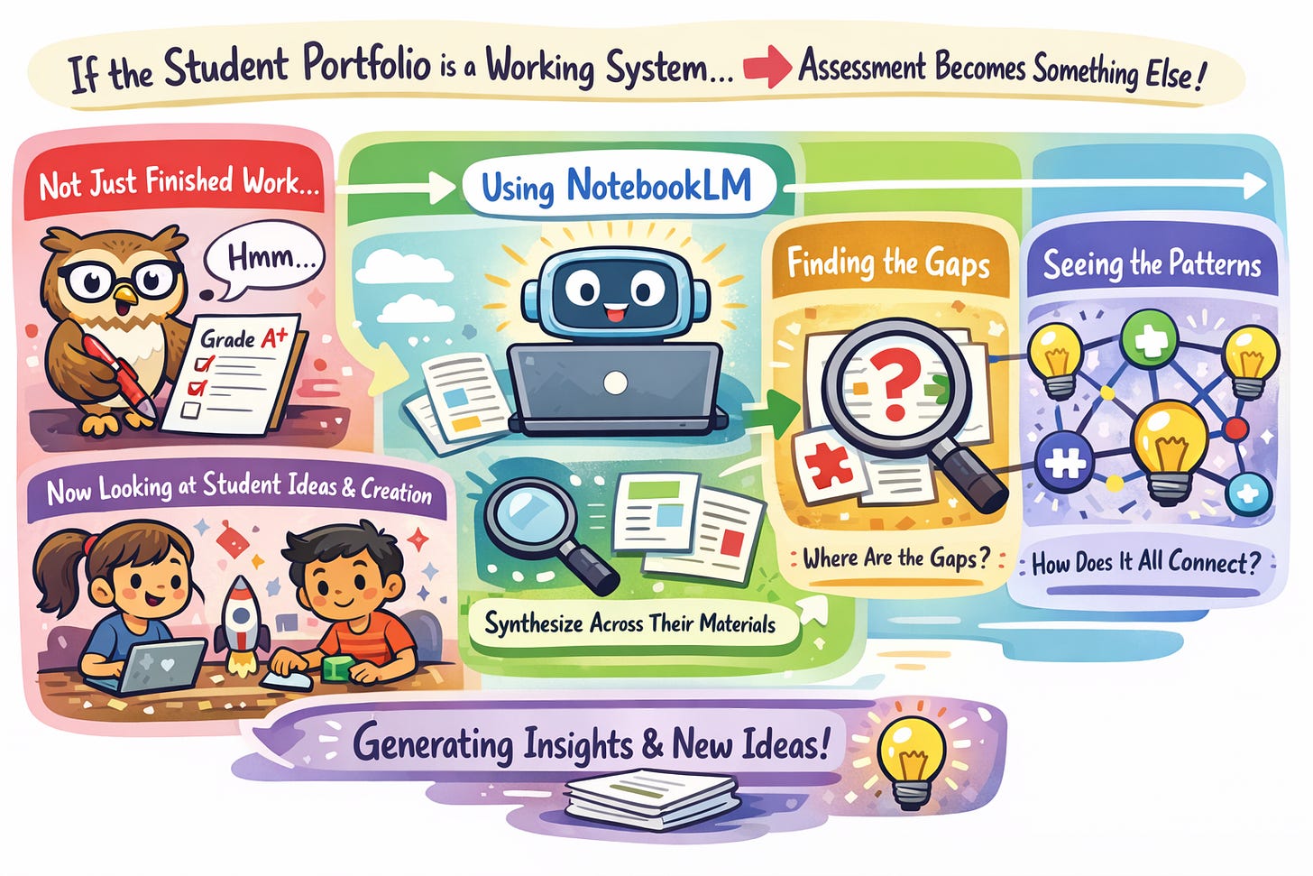 Tools like NotebookLM make this concrete. But the real change is reconceptualising what a portfolio does. Not an endpoint where learning goes to get evaluated. A living system where understanding develops through connection and generation.